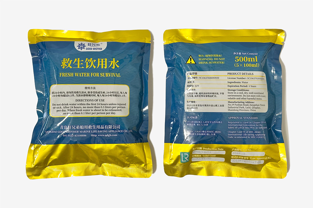 救生饮用水是在海上遇难时的必需品,配备于救生筏、救生艇和(半)充气救援艇。